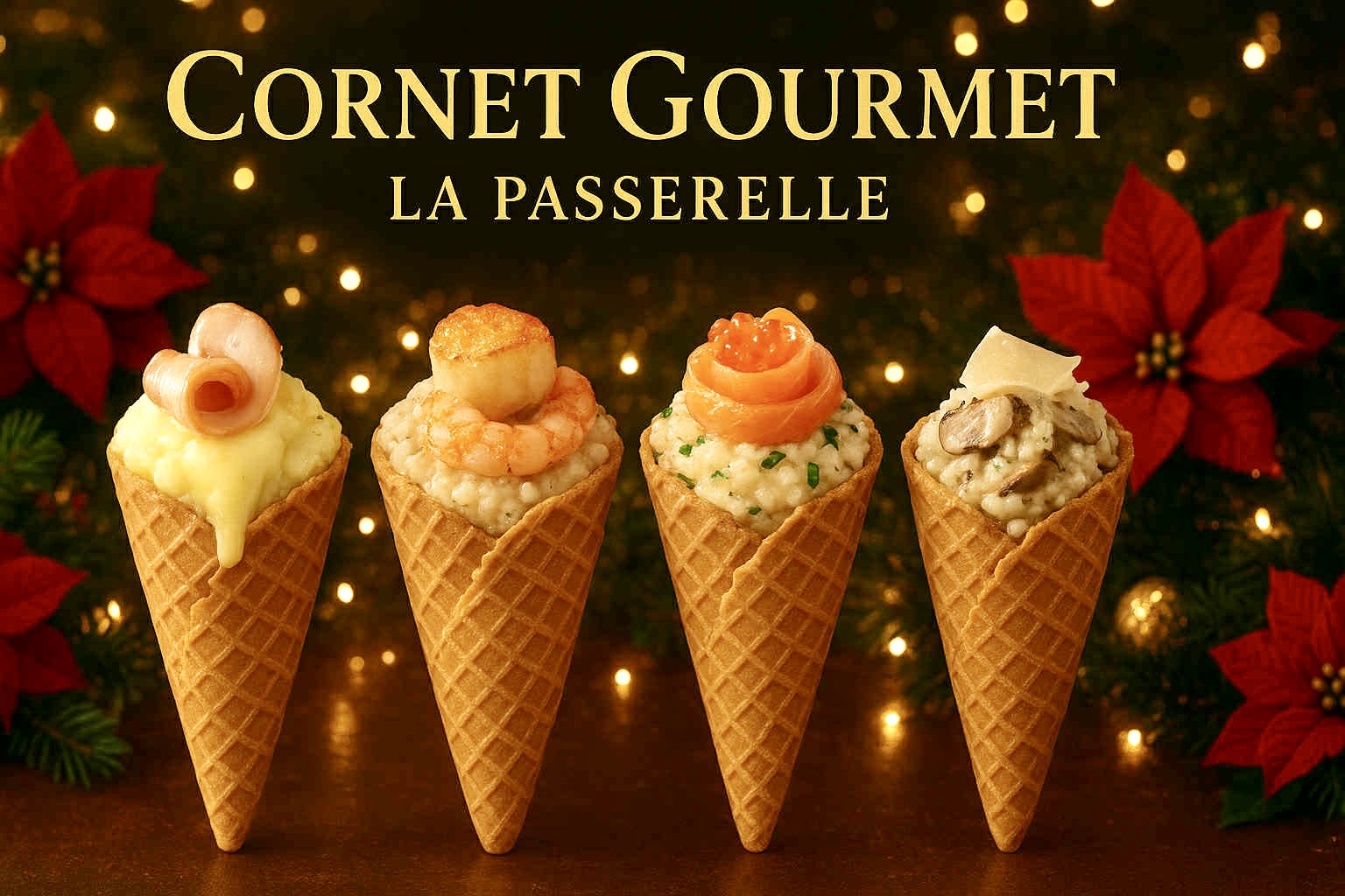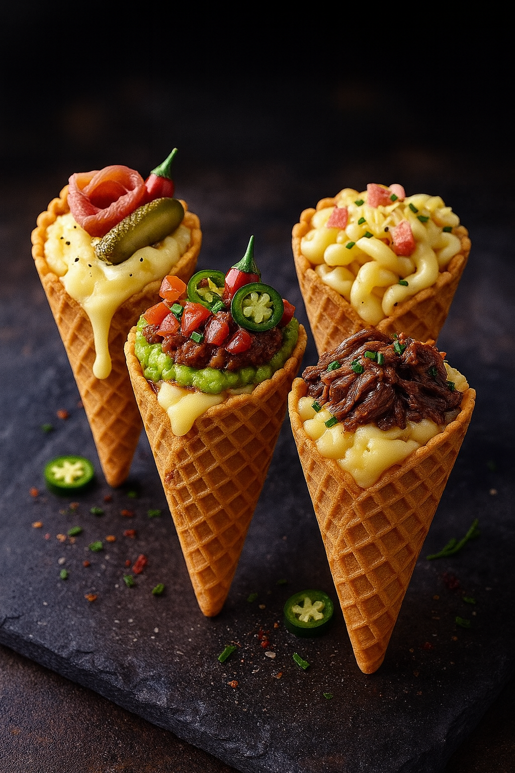 Charlotte revisite la street food de façon festive en proposant des cornets salés. Chaque cornet associe une base crémeuse, une garniture généreuse et un topping. Au menu : cornet raclette/charcuterie ou guacamole/chili/jalapeño ou purée/effiloché de bœuf ou coquillettes/jambon.