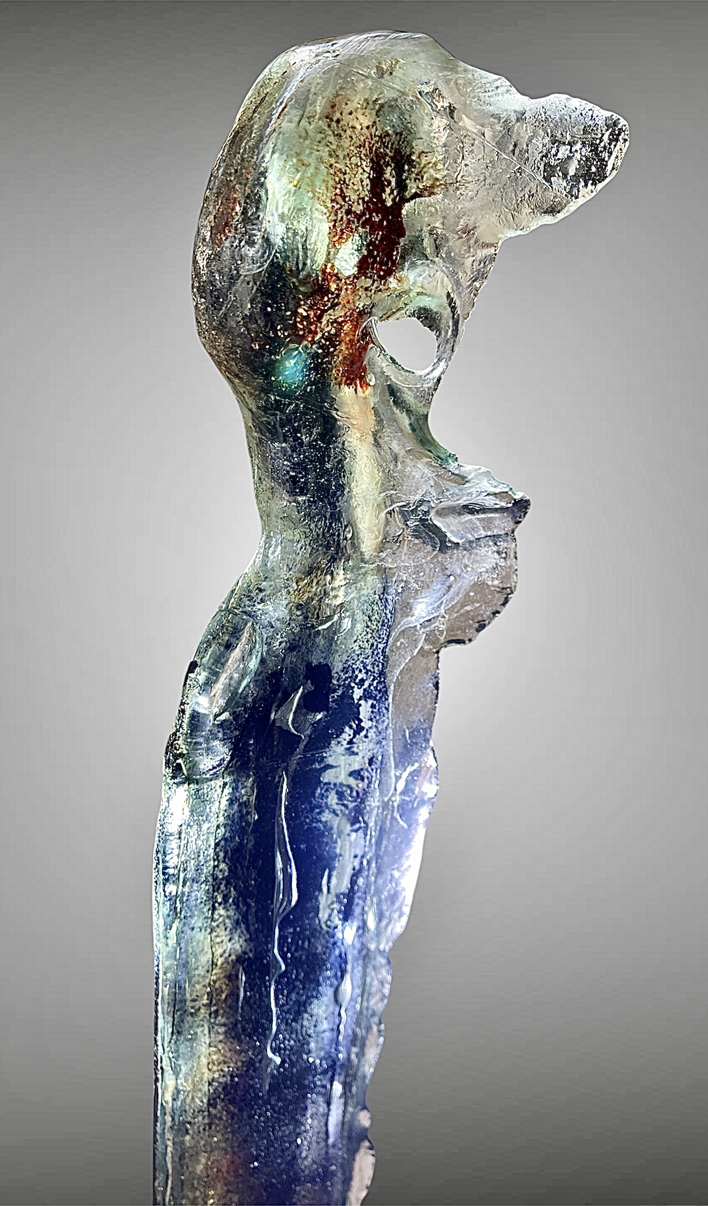 L’artiste ne s’impose rien et expérimente en permanence avec cette matière qui se joue de la lumière, pour traduire ses pensées et ses émotions les plus profondes. .Son vocabulaire artistique est vaste : sculptures naturalises ou abstraites, tableaux de verre aux reflets changeants et dernièrement un nouveau travail sur la pâte de verre.